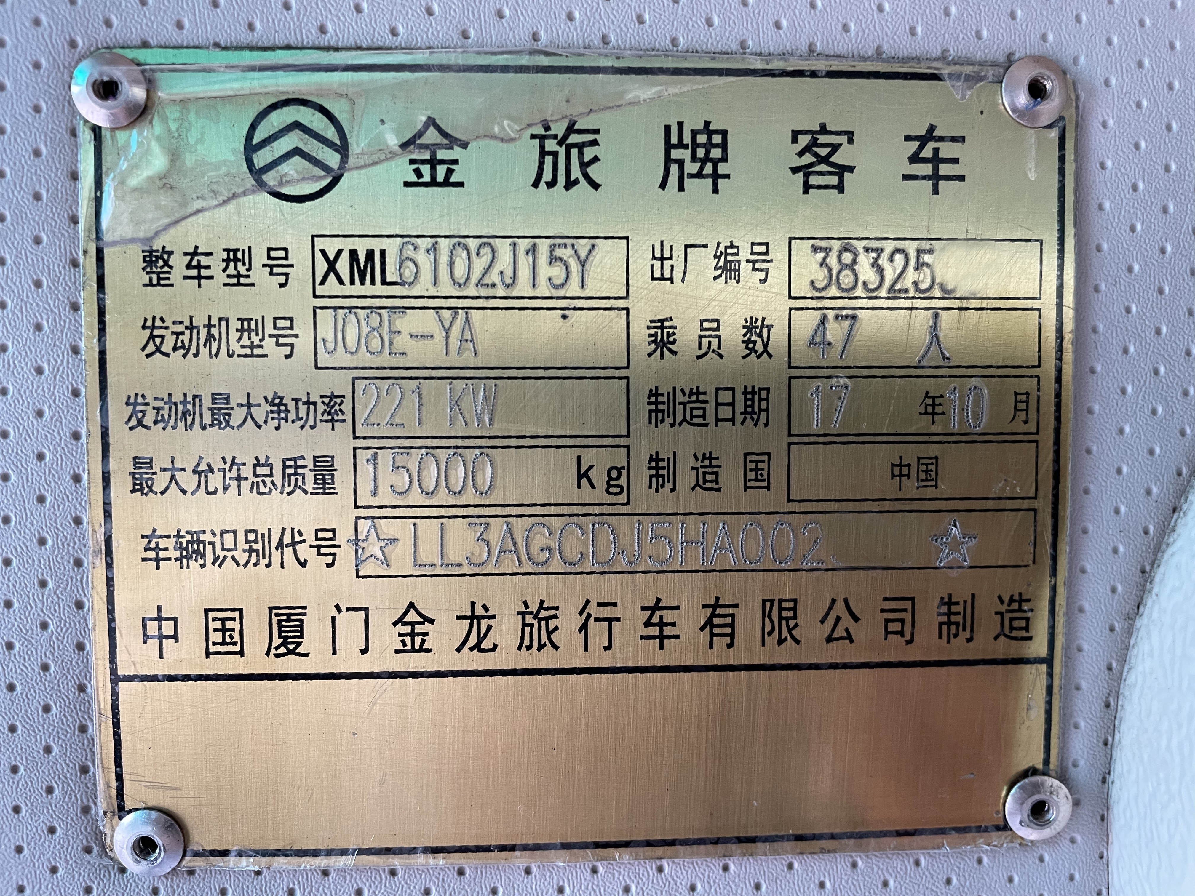 2017年11月份上牌金旅6102出售,47座 非营运 日野J08E发动机 国五排放 通仓电动上移门 杰信电装空调 美驰桥(懂车的知道)央企一手车