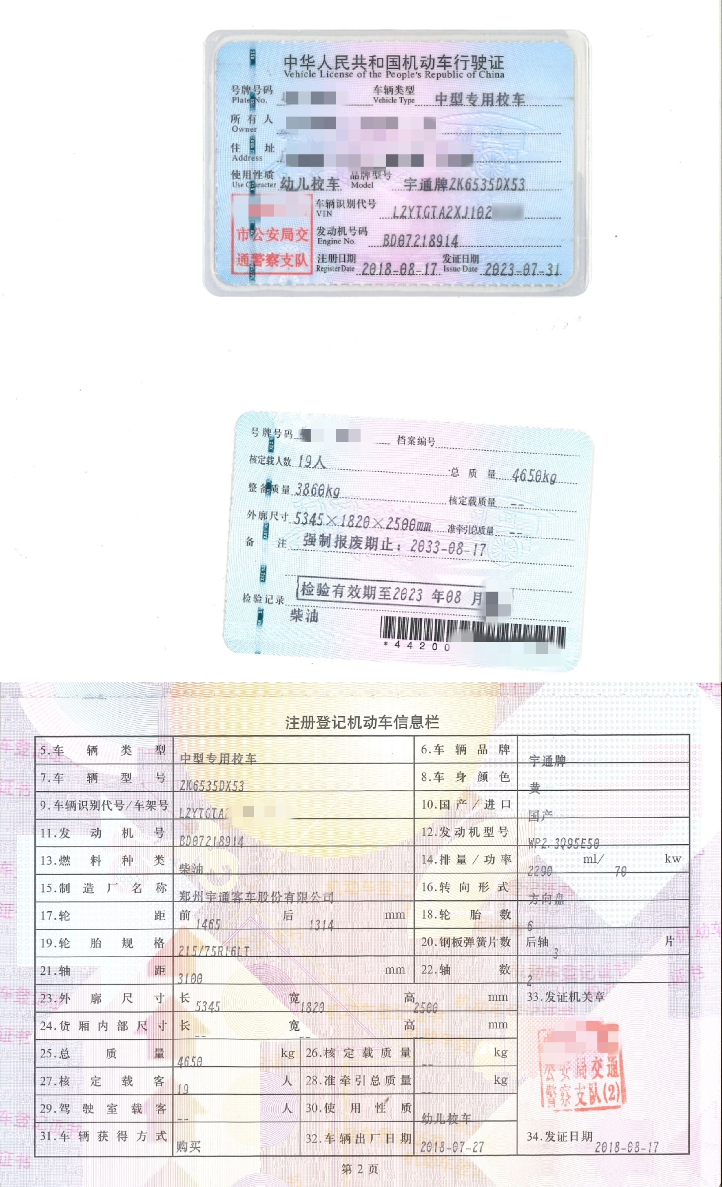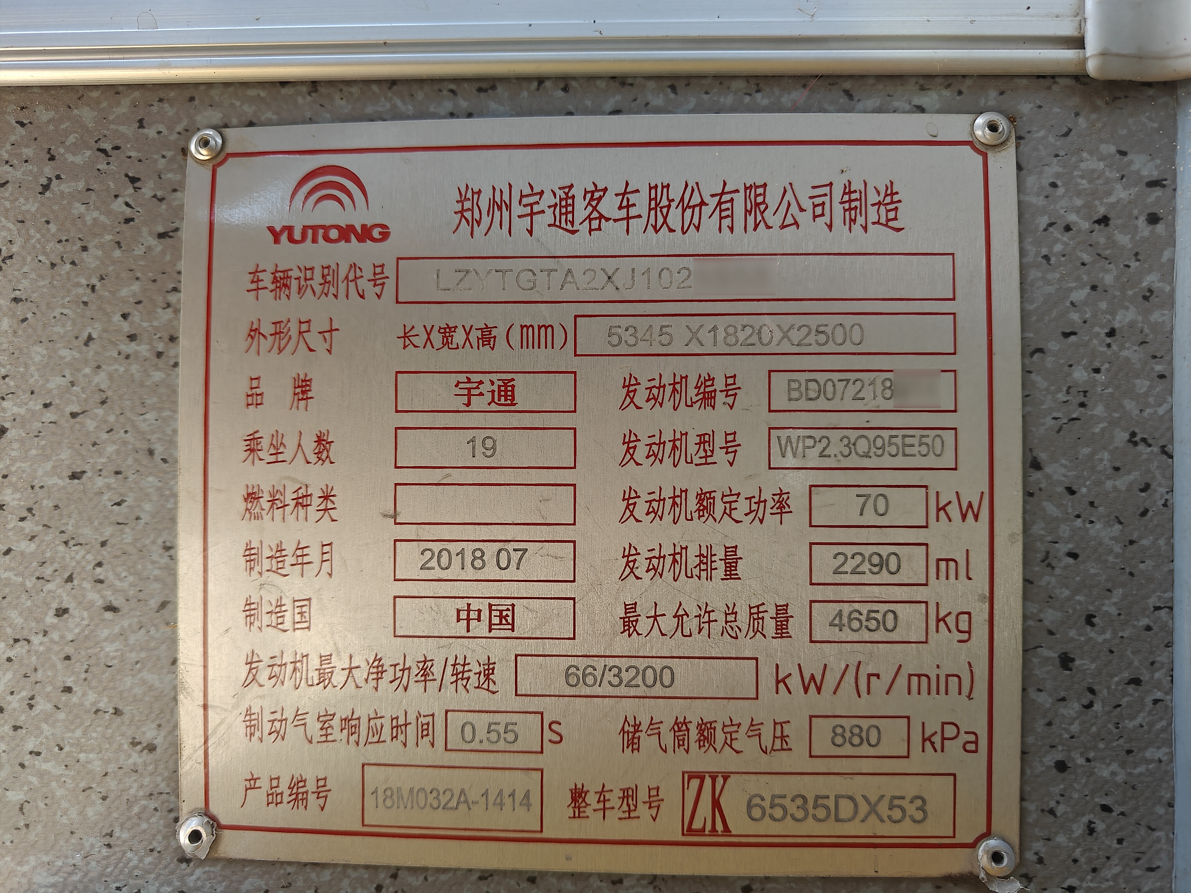 1.品牌型号:宇通ZK6535DX53