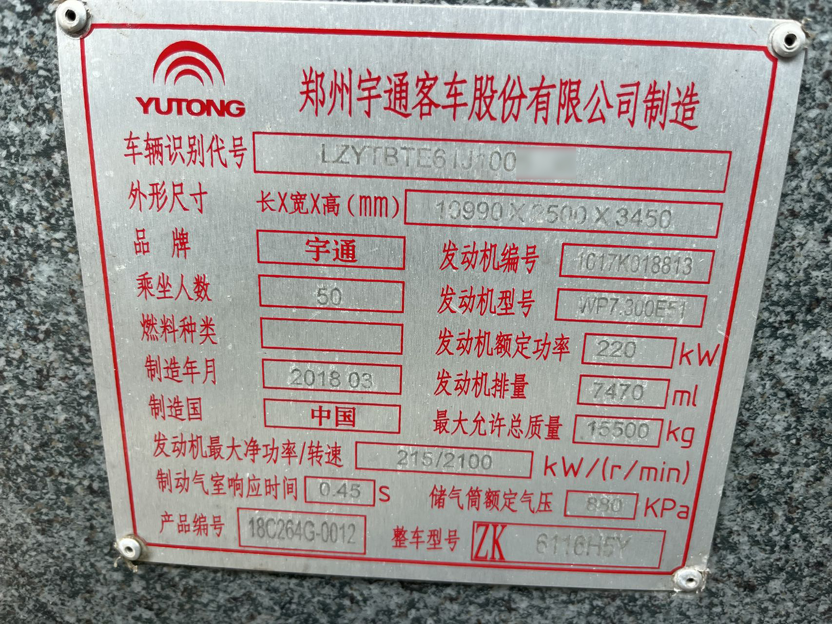 1.品牌型号:宇通ZK6116H5Y