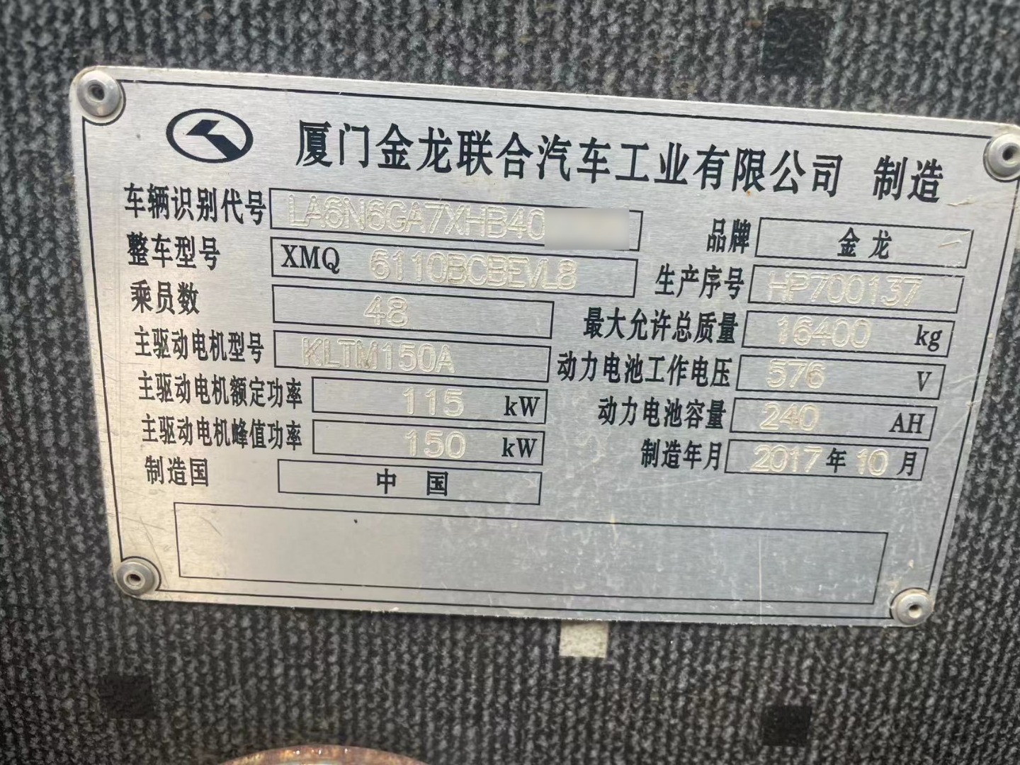 1.品牌型号:厦门金龙XMQ6110BCBEVL8