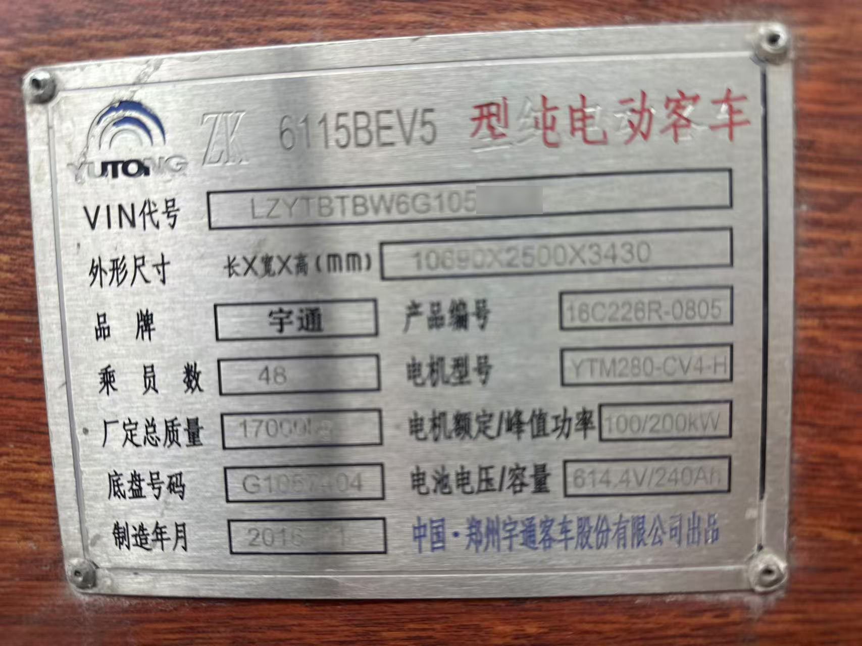 1.品牌型号:宇通ZK6115BEV5