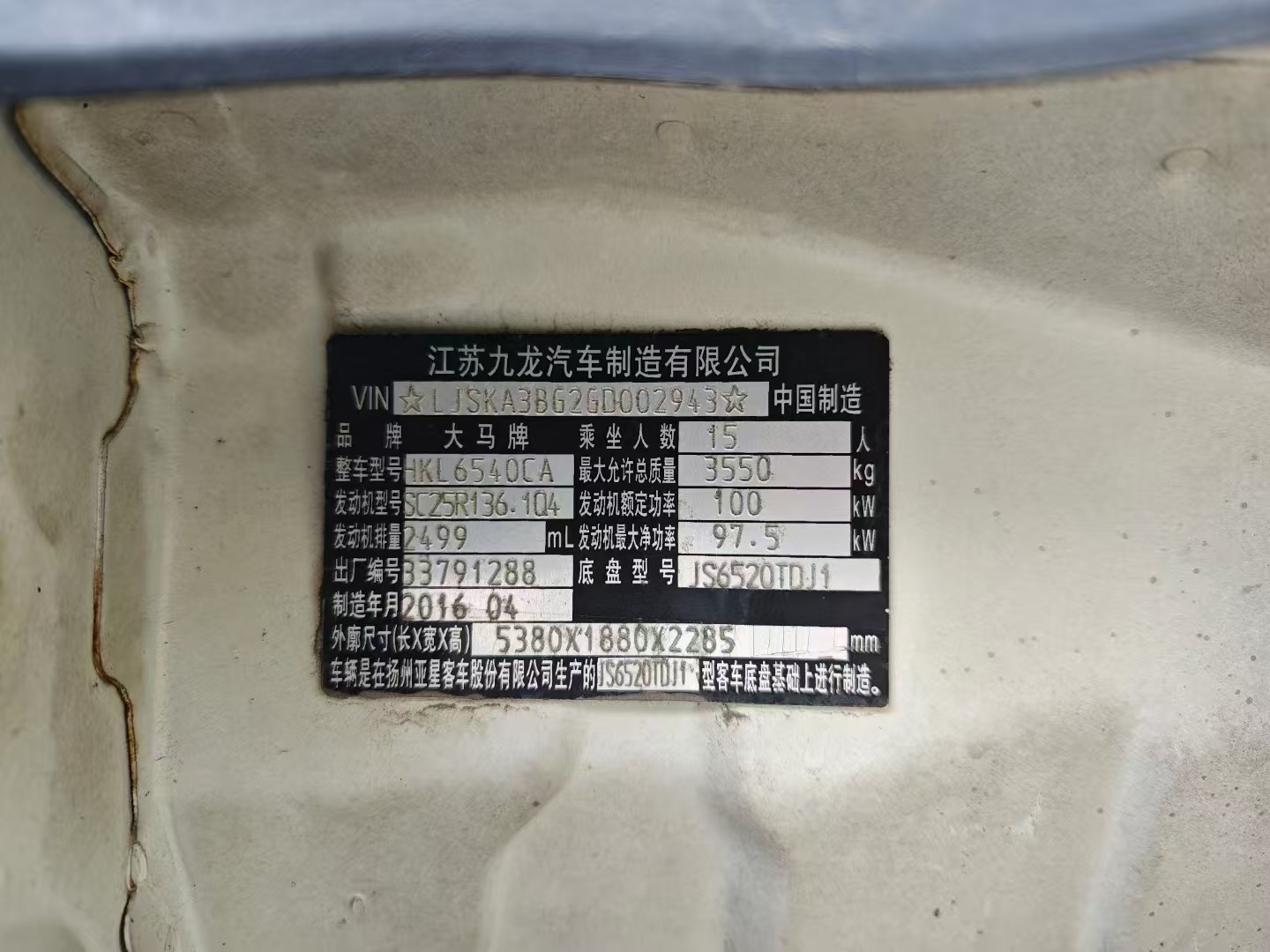 基本参数: 1.品牌型号:大马牌HKL6540CA 2.登记日期:2016年4月 3.核载人数:15 4.使用性质:非营运 5.行驶里程:18万多公里 6.推荐理由:A2B1可以开的中型客车,车长5.99米 ,柴油国四江铃2.8大马力发动机,原车漆