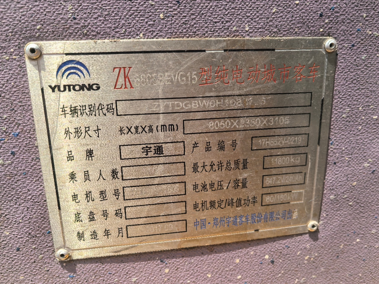 1.品牌型号:宇通6805BEVG15