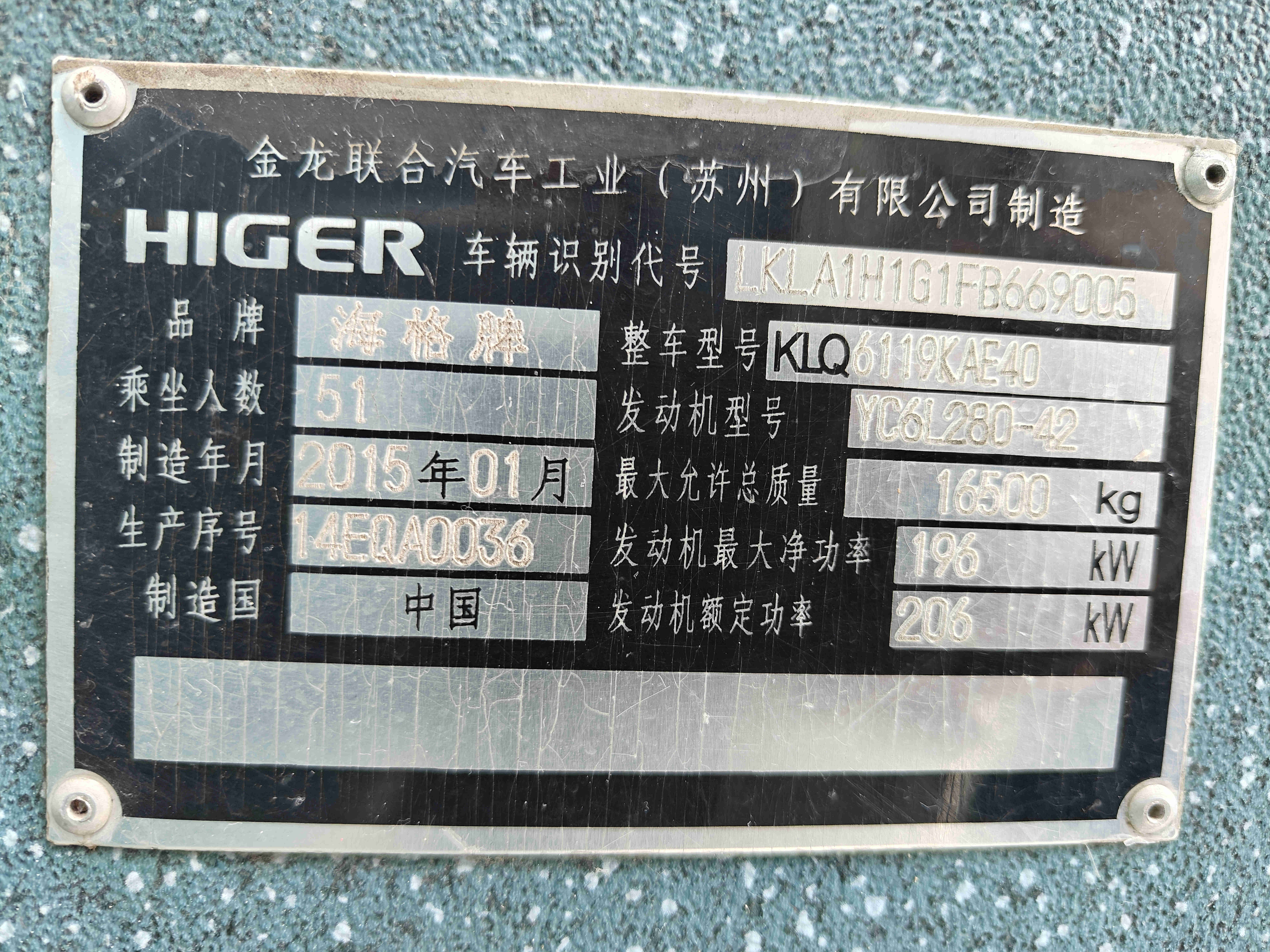 2015年1月上牌海格6119、非营运、51座、钢板、玉柴280发动机、双门、年审到2025年1月份