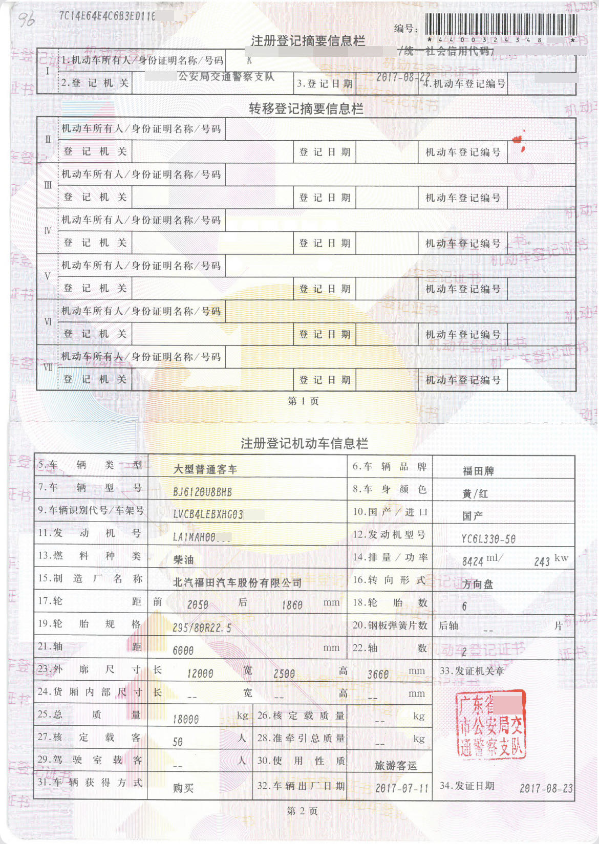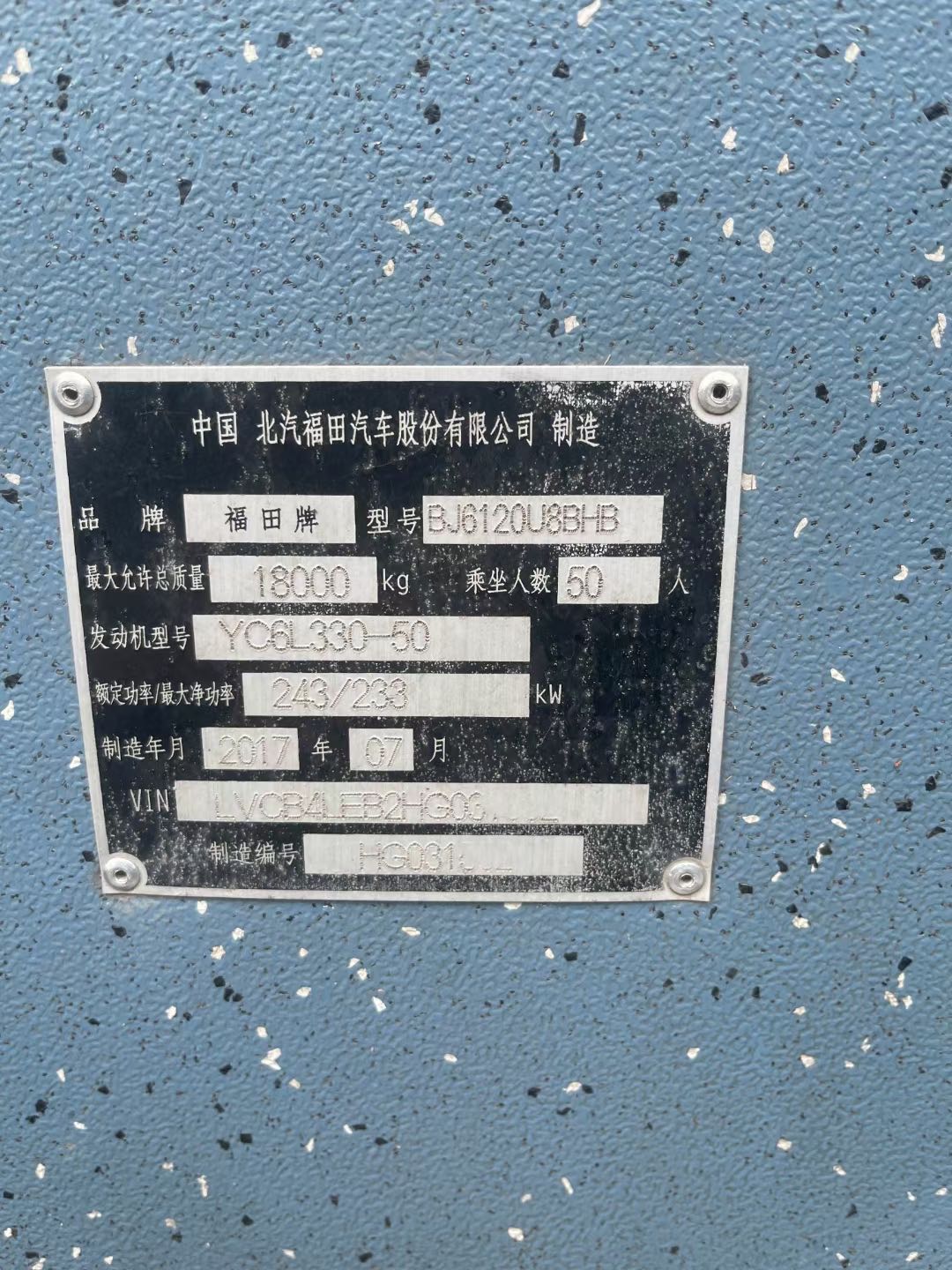 2017年8月上牌,福田12米营运,带营运公告,带中门50座,玉柴330马力国五,气囊减震,通勤班车使用公里数不高,旅游客运性质,带营运转籍单