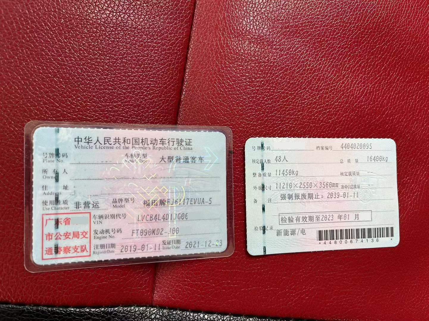 2019年1月福田6117EVUA-5、48座、非营运性质、中航162度电、双门、平底板、气囊减震、前碟后鼓、松芝空调、皮座椅、带行李仓、公里数在13-16万之间,年审到2025年1月。