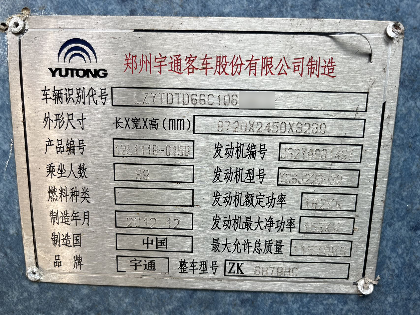 2012年12月出场宇通ZK6879、纯非营运、39座
