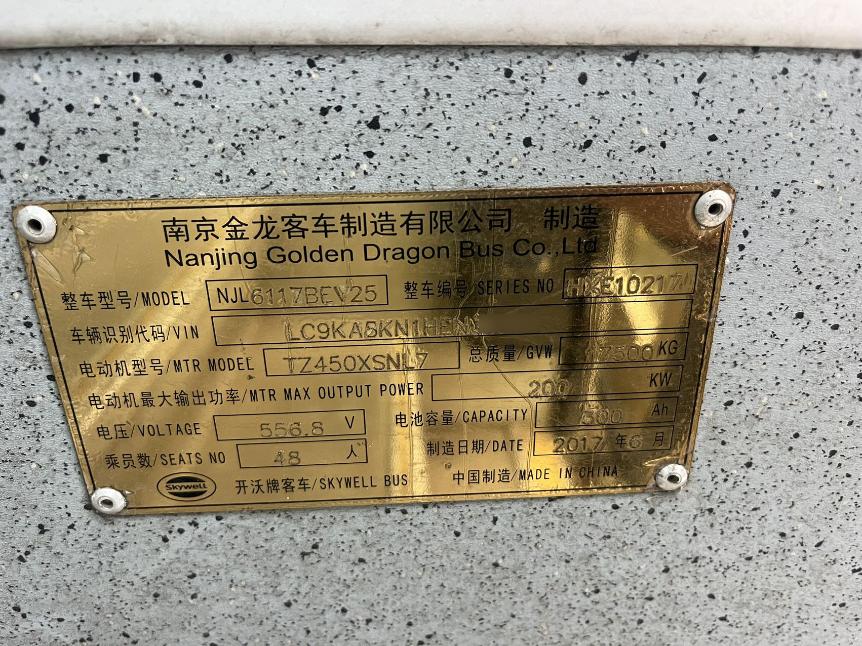 2017开沃6117 1.品牌型号:开沃NJL6117BEV25 2.上牌时间:2017年8月 3.核载人数:48座 4.使用性质:旅游客运 5.车辆配置:气囊减震、亿纬锂能167度电、绒布座椅、四轮碟刹、轮胎7成新