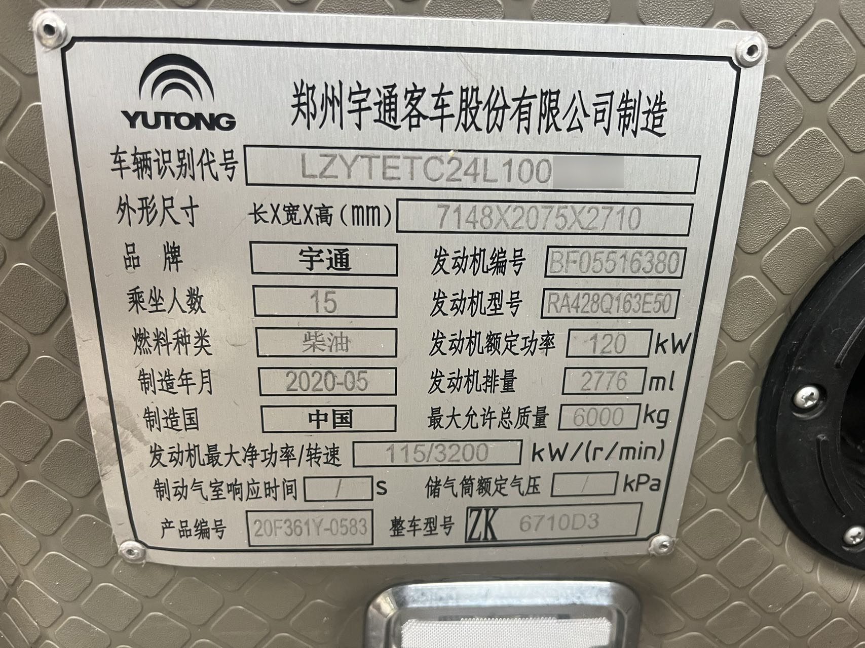 2020年宇通T7,旅游客运可营运转籍 新车落地五十多万,公里数10万左右,办公桌冰箱都可以安排上,手续齐全广东提车 1.品牌型号:宇通ZK6710D3 2.上牌时间:2020年6月 3.核载人数:15座 4.使用性质:旅游客运 5.动力排放:柴油版潍柴动力国五排放