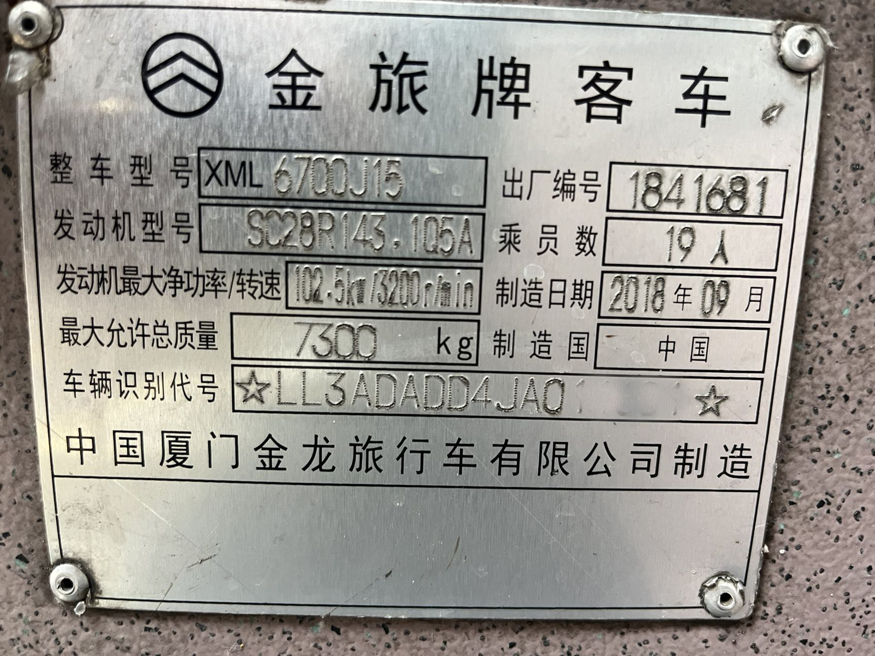 2018年9月金旅6700、19座、公路客运、上柴143发动机、外摆门,车况板正。